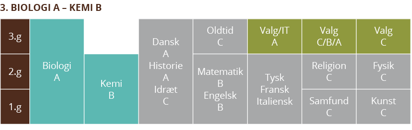 - I 3.g skal du vælge enten fysik A, kemi A, biologi B eller naturgeografi C som et af dine valgfag.